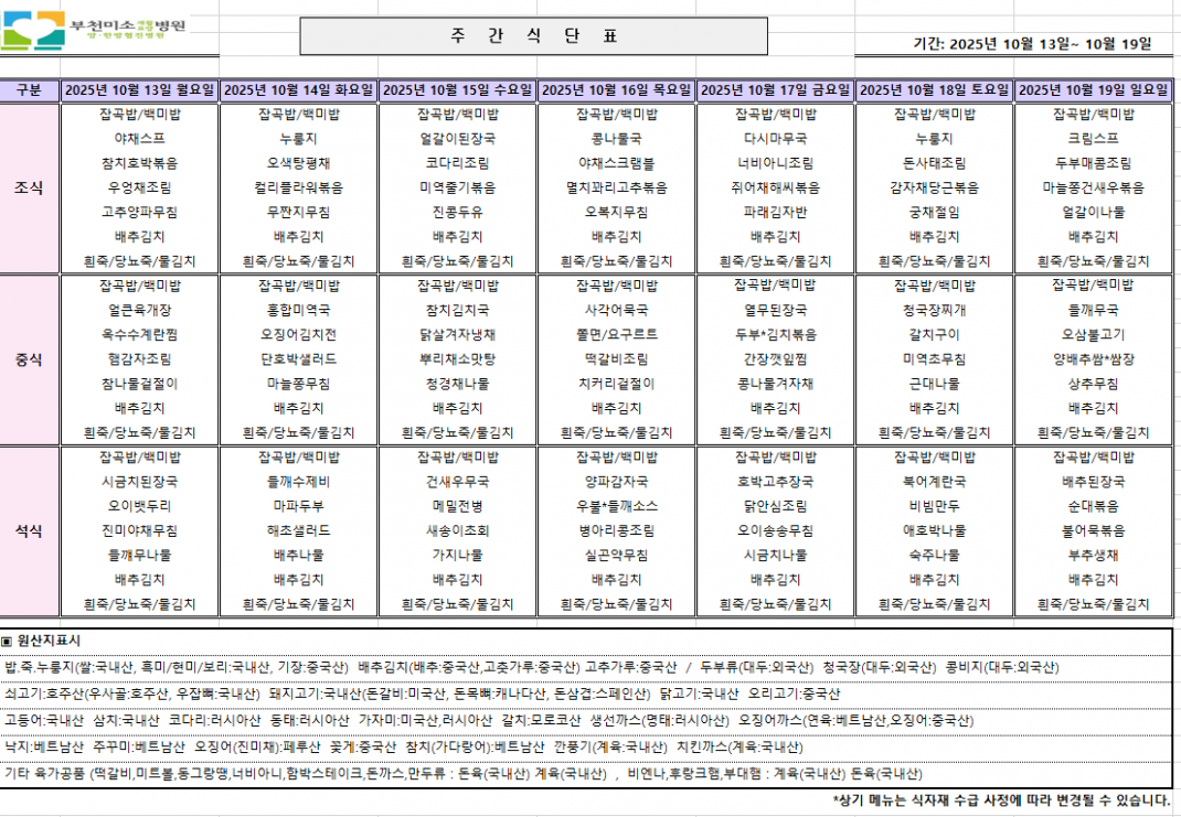 식단표 페이지 정보 작성자 관리자 댓글 0건 조회 71회 작성일 25-10-13 07:27 본문 목록 다음글상두대 옮기는 과정 ♥ 25.07.21 댓글목록 댓글목록 등록된 댓글이 없습니다.